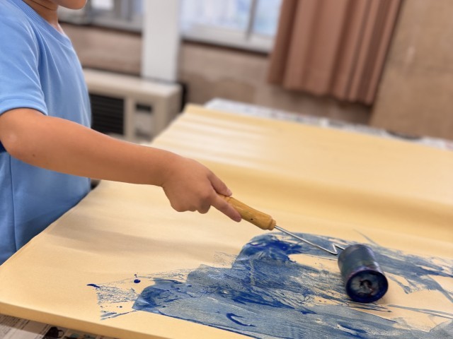 ペットボトルのキャップやスポンジなど身近な材料、絵の具専用のローラーを使って、絵の具をつけた材料を押したり、転がしたり。手に絵の具をつけて、思いきり紙に押しつける子もいました。