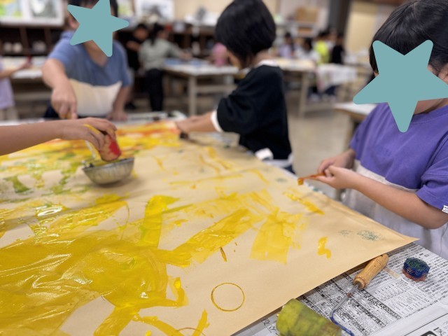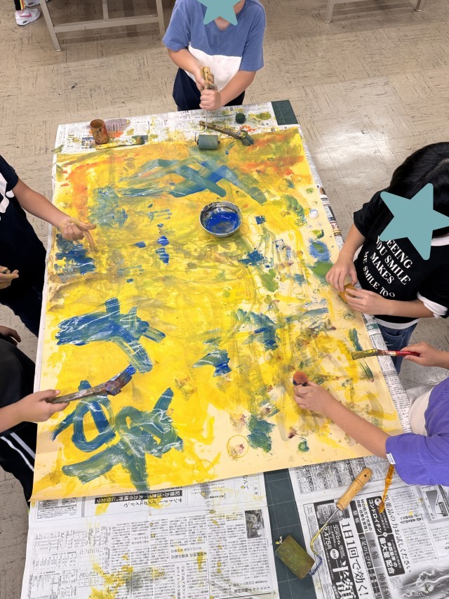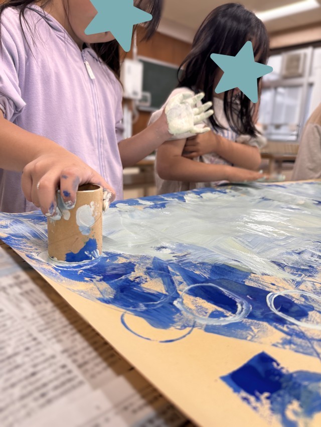9月25日 図工「ぺったんコロコロ」の学習で、大きな紙いっぱいに作品づくりをしました。
