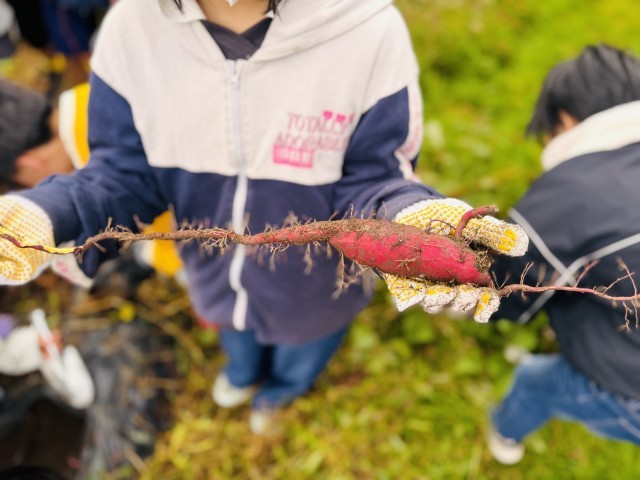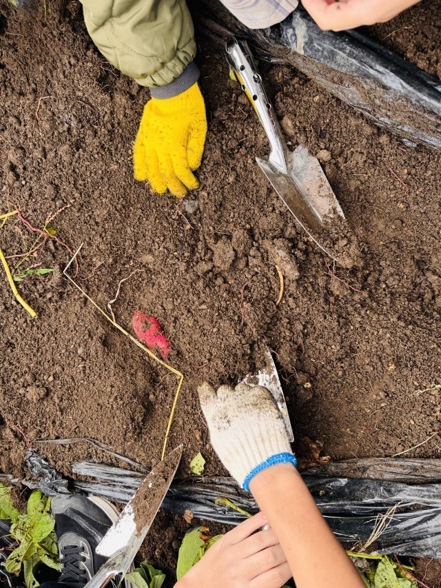 シャベルで土を掘ってもなかなかお芋が出てこず、「どこにあるのかな?」と少しあせる様子も見られました。ようやく土の中からサツマイモが顔を出したときには、「あった!」と嬉しそうな声があがりました。みんなで育ててきたサツマイモを収穫できて、達成感いっぱいの表情でした。