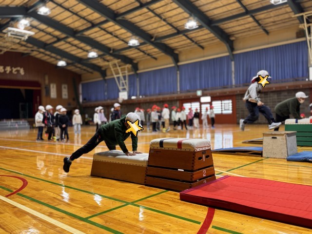 いろいろな種類の跳び箱を並べて練習しました。はじめは「こわいな」と言っていた子も、だんだんとコツをつかんで笑顔で跳べるように。「つぎはこっちの台で!」と意欲いっぱいに取り組む姿がとてもすてきでした。