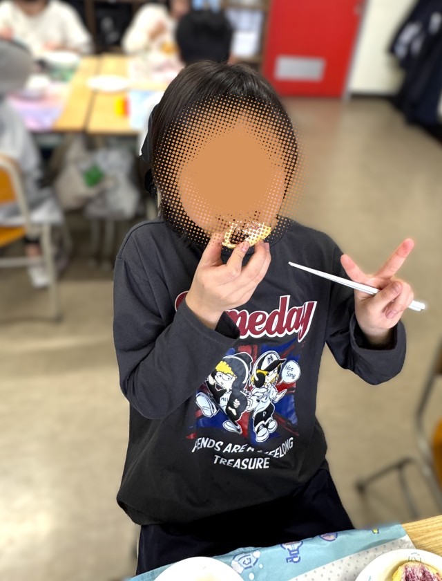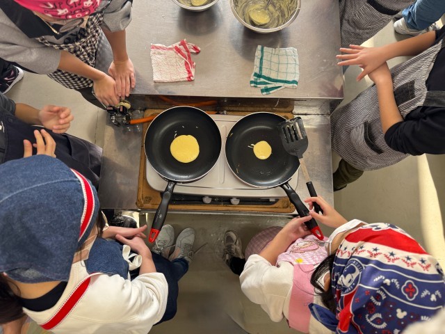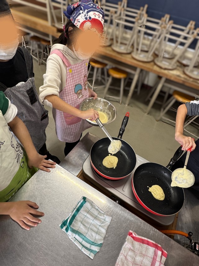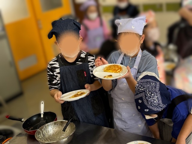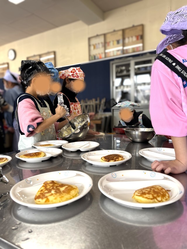 事前学習では、「ハスカップジャムをさらにおいしく食べるには、どんな味が合うだろうか」と考え、ホットケーキに添えて食べることにしました。初めて火を使う本格的な調理実習でしたが、児童は落ち着いて調理に取り組み、ホットケーキを返すタイミングを「今かな、まだかな」と真剣な表情で見極めながら焼いていました。ふっくらと焼き上がったホットケーキに、ハスカップジャムとクリームを添えて味わい、「すっぱい。でも、このすっぱさが甘いホットケーキやクリームに合う」と、笑顔でを味わっていました。