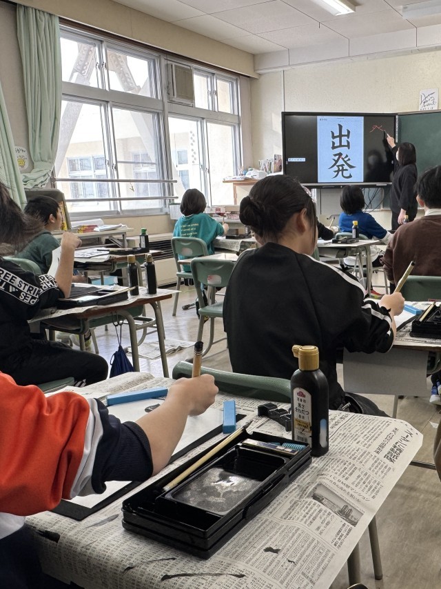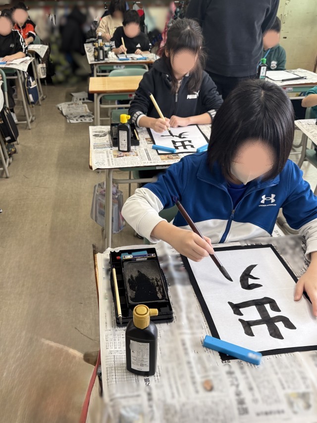 4年生 書写 公開日 2026/01/21 更新日 2026/01/21 学校生活 +1 1月21日 4年生 書き初めの様子書写の時間に、4年生が書き初めに取り組みました。教室はとても落ち着いた雰囲気で、子どもたちは静かに集中しながら筆を運んでいました。お手本をじっくりと見比べ、半紙に筆を置く位置や文字の大きさ、バランスに気を配りながら、一文字一文字を丁寧に書いていました。新年の始まりにふさわしく、真剣な表情で書き上げる姿に成長を感じました。 4年生