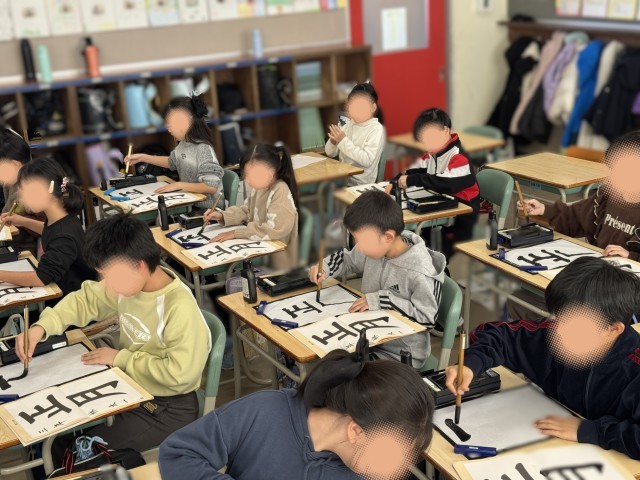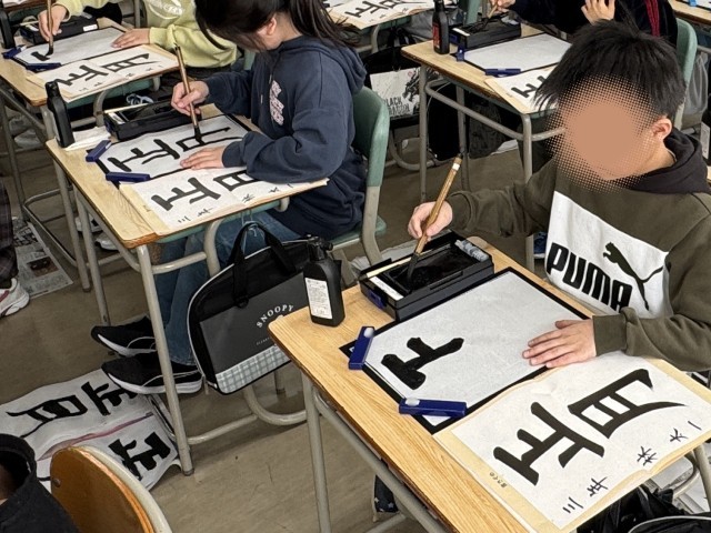 3年生 書写 公開日 2026/01/22 更新日 2026/01/22 学校生活 +1 1月22日 3年生 書き初めの様子今日は3年生が、書き初めで「正月」の文字を書きました。教室は静かな雰囲気に包まれ、ときおり先生が「筆を立てて」「ゆっくりと」と声をかけながら、子どもたちの様子を見守っていました。児童たちは、お手本をよく見て集中して取り組み、書き上げた作品の中から友だちと相談しながら納得のいく一枚を選び、最後に丁寧に名前を書いて仕上げていました。 3年生