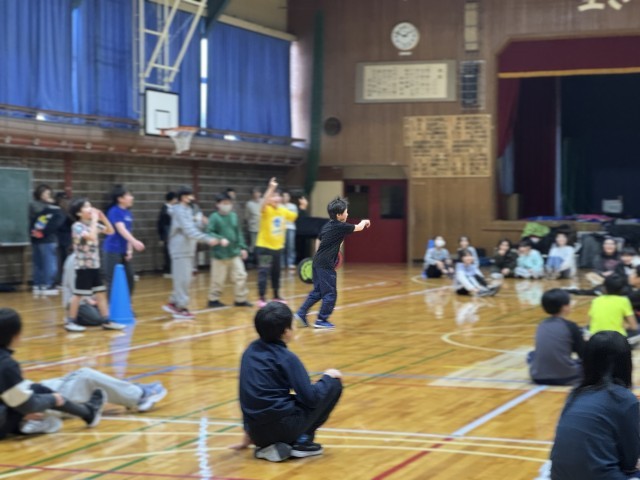 給食の後は、新聞ジャンケンやドッチビーで体を動かしました。ドッチビーでは、<1組の保護者>VS<2組の保護者>の対決となり、子どもたちの応援にも熱が入ります。白熱した応援合戦が繰り広げられ、会場は大きな歓声と拍手に包まれました。保護者の皆さんの本気のプレーに、子どもたちも大盛り上がりの楽しい時間となりました。