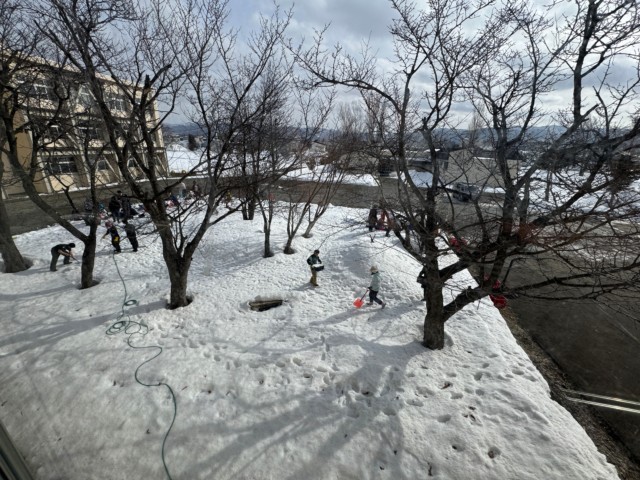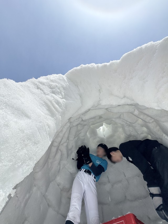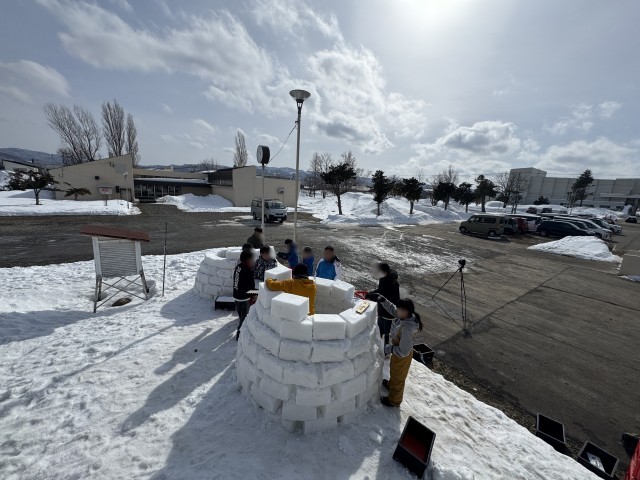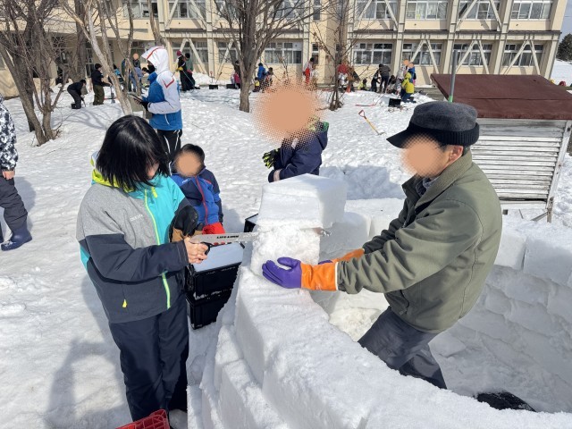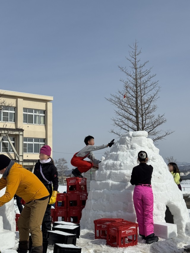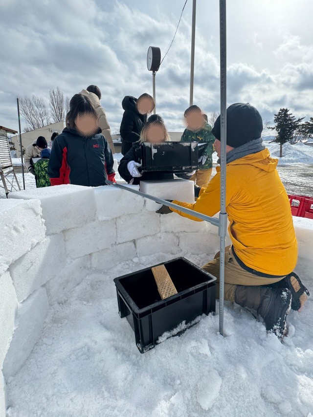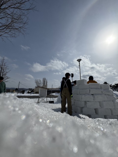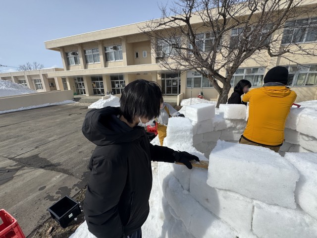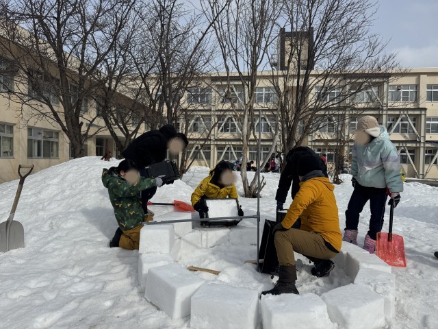コンテナに雪に詰め、押し固めた圧雪ブロックを雪用のこぎりを使って形を整えながら積み上げていました。雪を掘ってコンテナに詰めたり、そのブロックを運んで積み上げるの繰り返し。思った以上に体力を使う作業で、汗をかきながらも楽しそうに取り組んでいました。完成に近づくにつれ達成感も高まり、冬ならではの貴重な体験となりました。