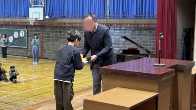 離任式では、代表の児童がこれまでお世話になった先生方へ、感謝の気持ちを込めて手紙を手渡しました。ステージ上でのやり取りからは、子どもたち一人ひとりの思いが伝わってきました。