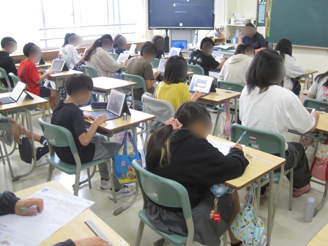 本日の3校時、5年2組「社会」、5年1組「国語」、6年2組「算数」、6年1組「外国語」の様子です。