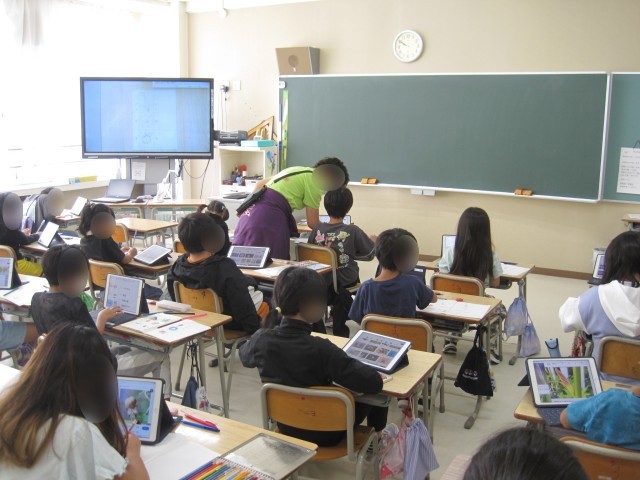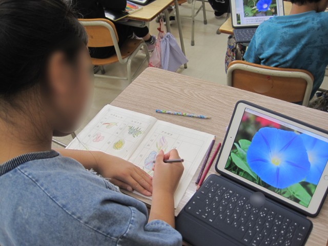 1組は「理科」です。タブレット端末で植物の写真を観察し、ノートにまとめました。画像を拡大しながら細かいところまで良く観察していました。