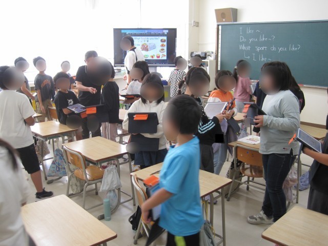 2組は「外国語」です。友達や先生と英語で好きな食べ物を質問し、会話の練習をしました。