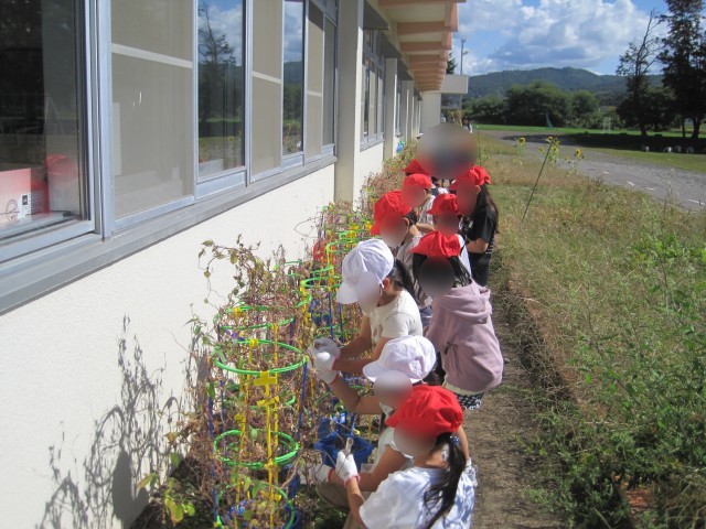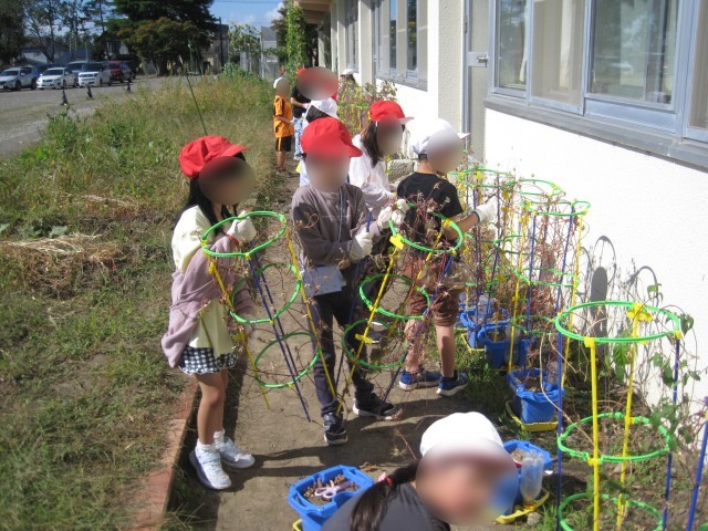 朝顔の蔓は支柱に絡みついていて取るのが大変です。みんな一生懸命手を動かして、蔓が切れない様に気をつけながら取り外していました。