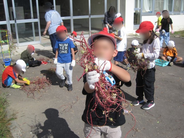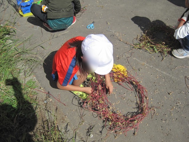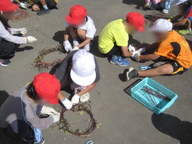 自分たちで育てた朝顔が咲き終わりました。長く育った朝顔の蔓をまとめて丸くし、リースを作りました。