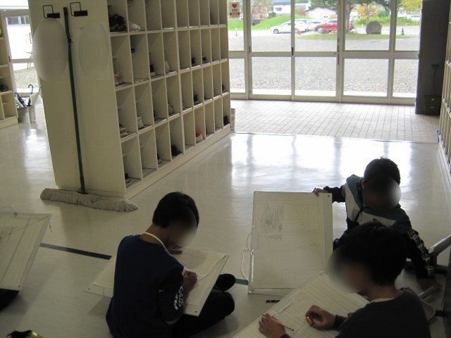 1組は「図工」、校内のお気に入りの場所を描きました。