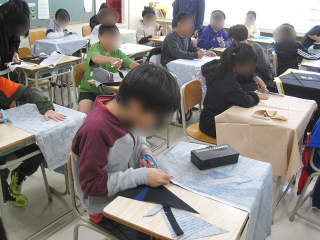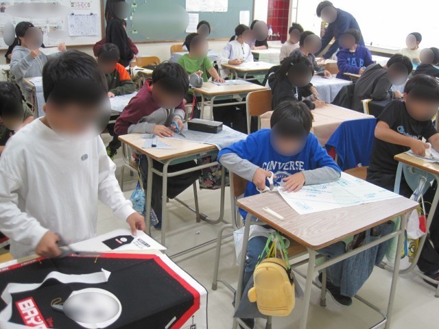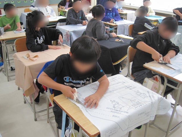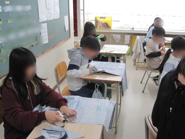 2組は「家庭科」、エプロン作りです。布の裁断を行いました。