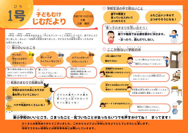 子どもむけ「じむだより」を掲載しました【10/23】 公開日 2025/10/23 更新日 2025/10/23 お知らせ 子どもむけ「じむだより1号」を「配布文書」に掲載しています。ぜひご確認ください。