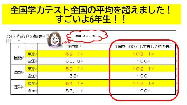 今年の4月に、6年生を対象に実施した「全国学力・学習状況調査」で、東小の6年生は国語・算数・理科すべての教科で全国平均を超えているという結果になりました。