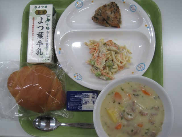 本日の給食【12/4】 公開日 2025/12/04 更新日 2025/12/04 お知らせ 本日の給食です。・バターロール・ブルーベリージャム&マーガリン・さつまいもシチュー・チキン香味揚げ・ごぼうサラダ
