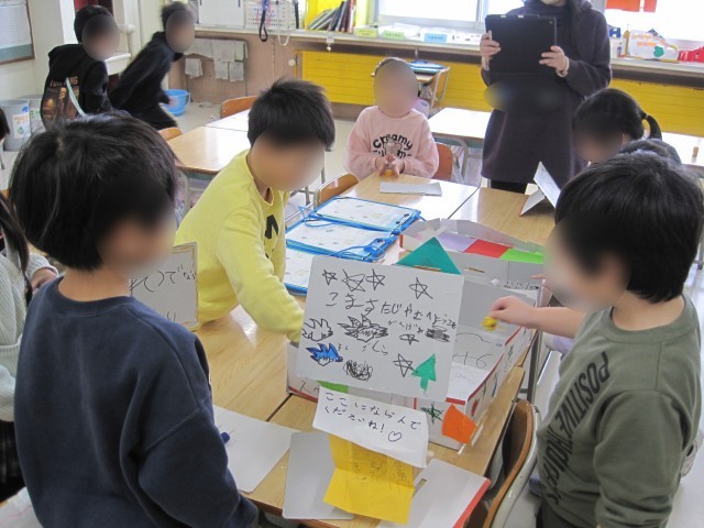 2年生が工夫を凝らして作った楽しいおもちゃに1年生は大喜び!