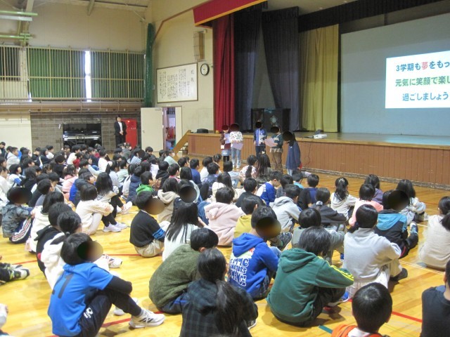 その後、児童会副会長からのお話、そして1年生と4年生の代表児童による作文発表がありました。家族と楽しく年越しをしたり、スポーツにチャレンジしたり、充実した冬休みを送ったことが伝わってきました。