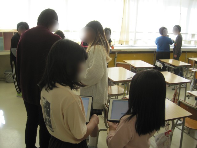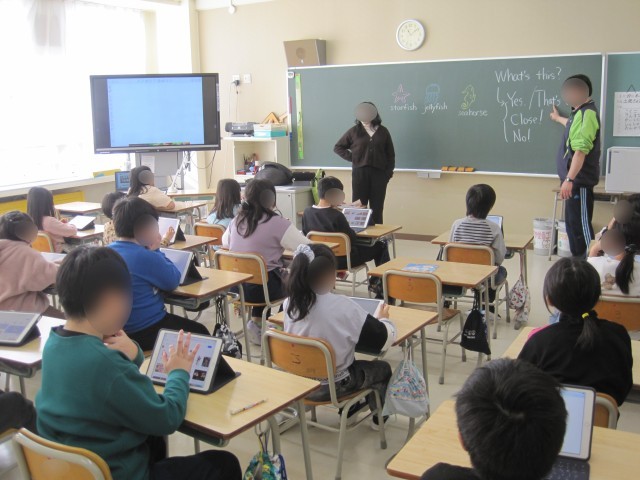 タブレット端末でクイズを作り、お互いに英語で会話しながらクイズを出し合って交流しました。