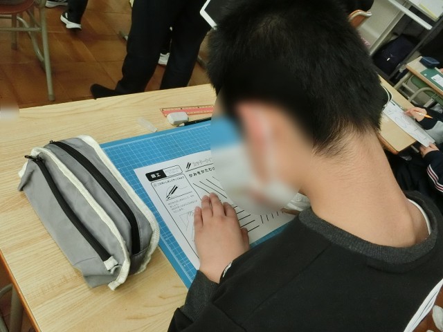 東中の先生から、カッターナイフなど道具の使い方を教わり、中学生の皆さんと一緒に集中して作業を進めることができました。