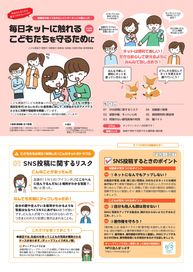 『毎日ネットに触れるこどもたちを守るために』【2/20】 公開日 2026/02/20 更新日 2026/02/20 お知らせ こども家庭庁からのお知らせリーフレットです。「配布文書」にも掲載しています。ぜひご確認ください。 +1