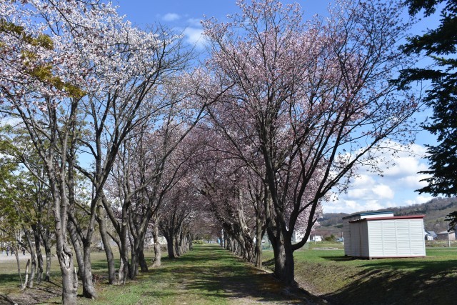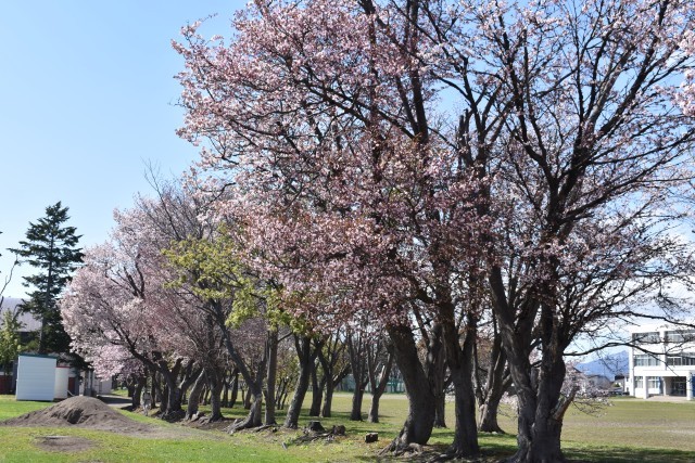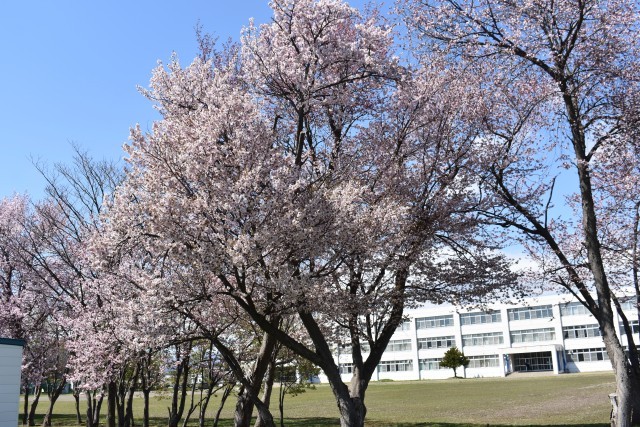 グラウンド横の桜が見頃を迎えています。例年よりも少し早めです。