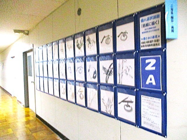 2年生の美術科の作品です。原画を自身で選び、色紙に水墨画を描きました。濃淡、筆の...
