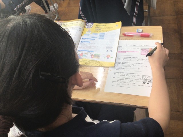 生徒はプリントに挑戦し、単語の意味や手助けを申し出るときの「Would you like me to ~」の活用について理解を深めていました。