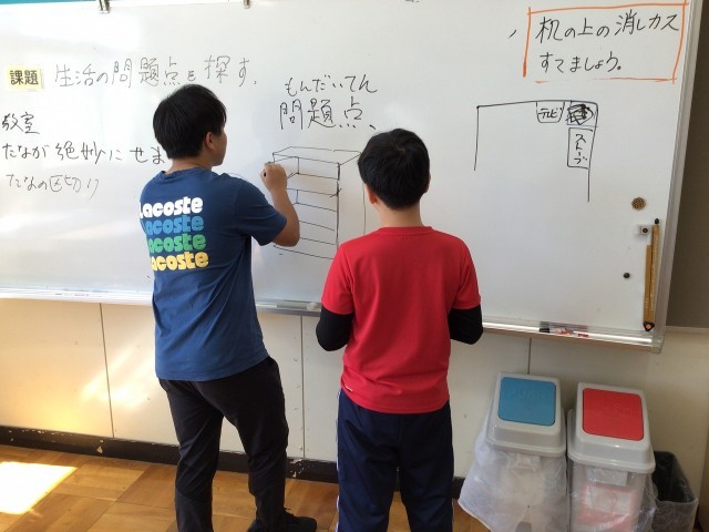 1Fは「生活の問題点を探す」を課題に、自分の物をスッキリ収納するための工夫について考えていました。
