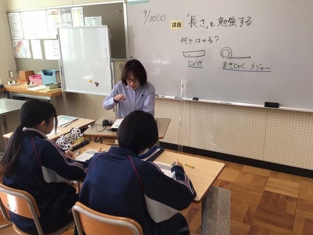2Gは「長さ」を勉強するを課題に、ものさしや、まきじゃくの使い方を学習し、筆記用具やA4プリントの縦、横の長さを測る練習をしていました。