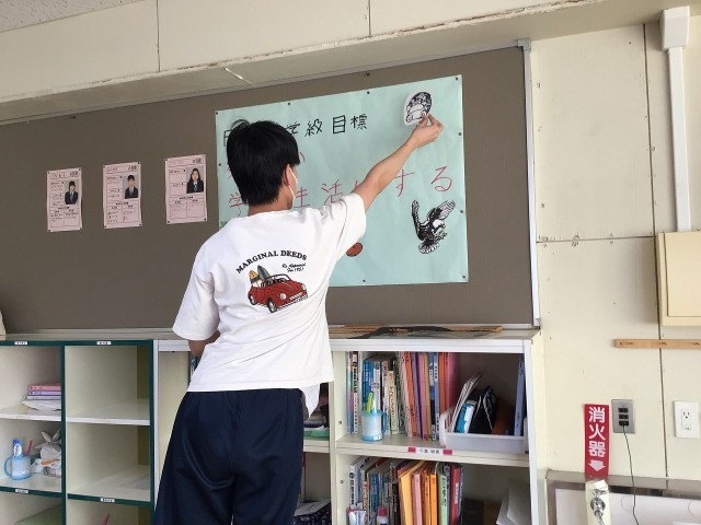 3FGは切り絵を完成させ、学級目標に彩りを加えていました。