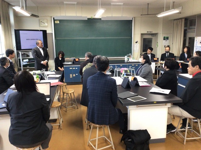 本日の5校時、1B理科を公開し、市内の小・中・高校の先生方などが集まり、授業参観及び研究協議を行いました。