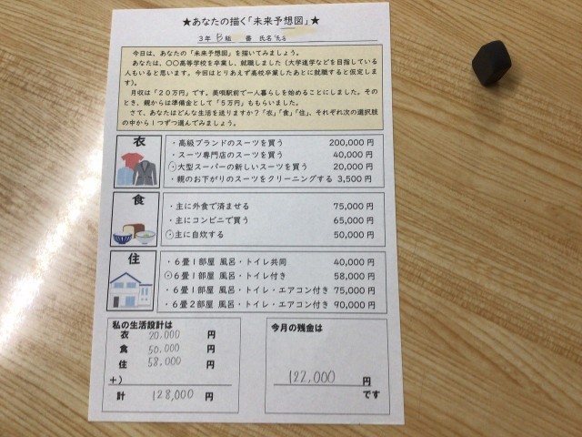 衣・食・住の3つの柱に対し、自分はどのような選択をすることで、生活費がどれくらい掛かり、どれだけのお金を残すことが出来るのかをシミュレーションし、交流していました。