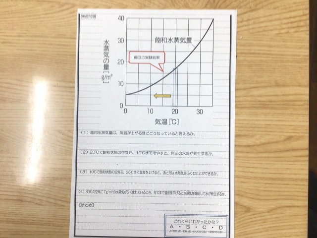 飽和水蒸気量を示すグラフなどを元に、気温が変化したときに、水蒸気が凝結して水滴になる量について考えていました。