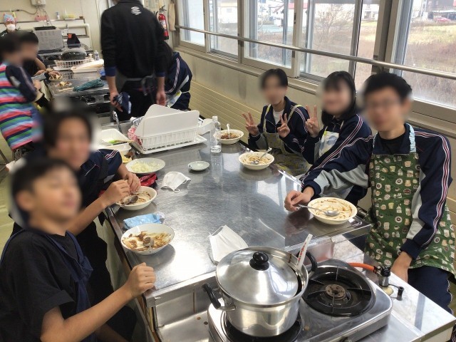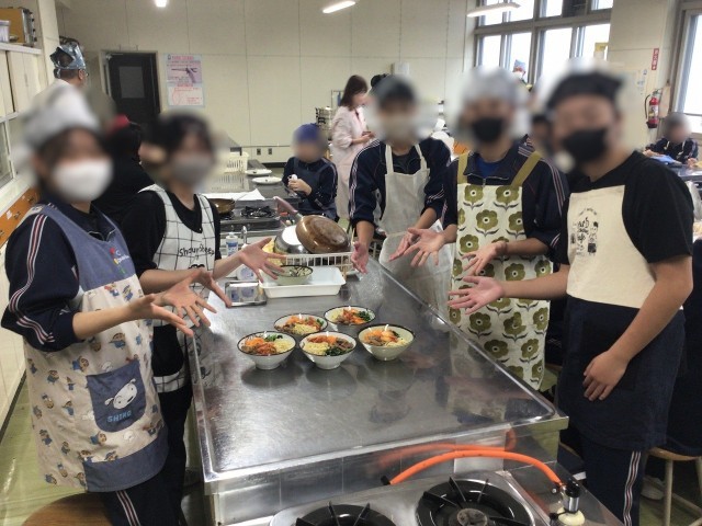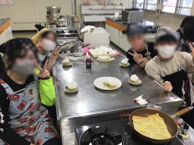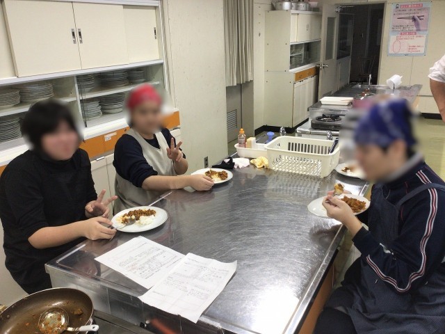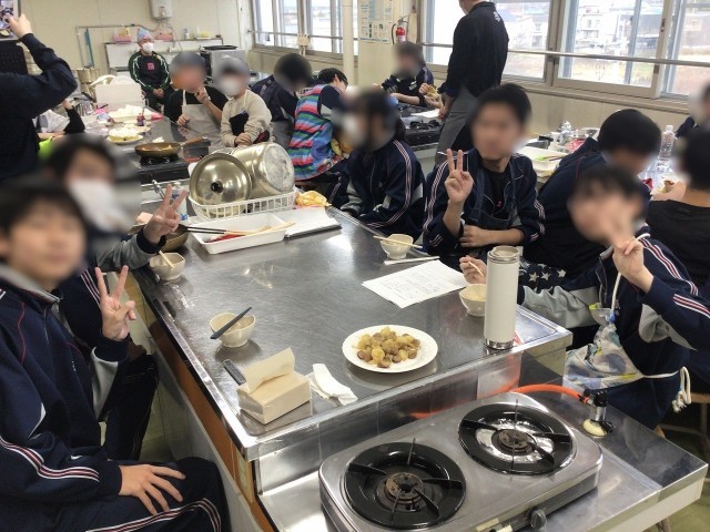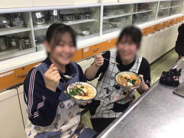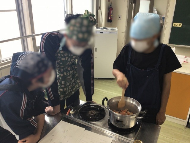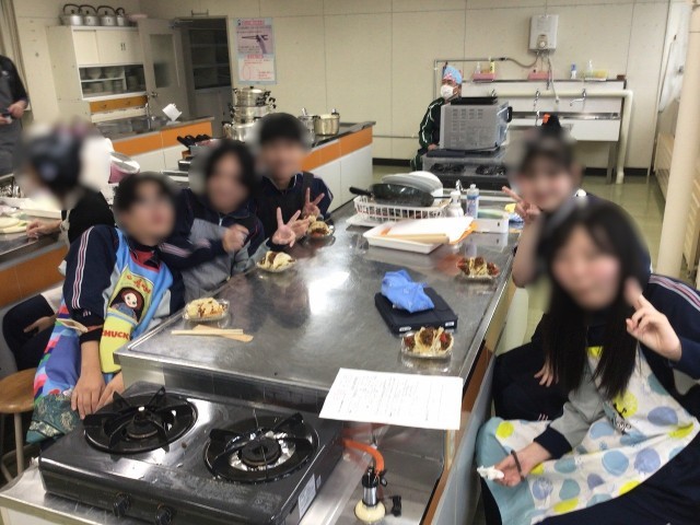また、今日の様子を見ていると、タコスの皮を単純に平らに焼くのではなく、中の具材を入れたときに持ちやすいよう丸めていたり、電子レンジや蒸し器を使わず、フライパンに水と布巾をいれて蒸す作業を行ったり、サツマイモの裏ごしを丁寧に行ったりと、どの班も美味しく工夫、食べやすくなる工夫、見た目が良くなる工夫などを考えて、実践していました。
