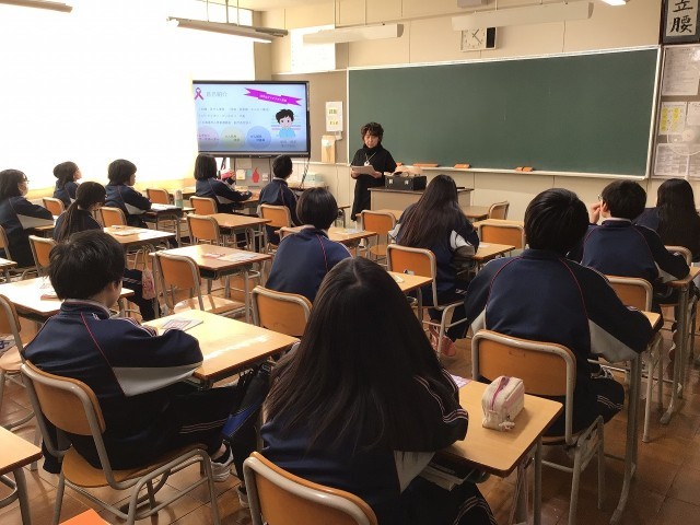 本日の5校時、2年生の保健体育で外部講師によるがん教育を行いました。