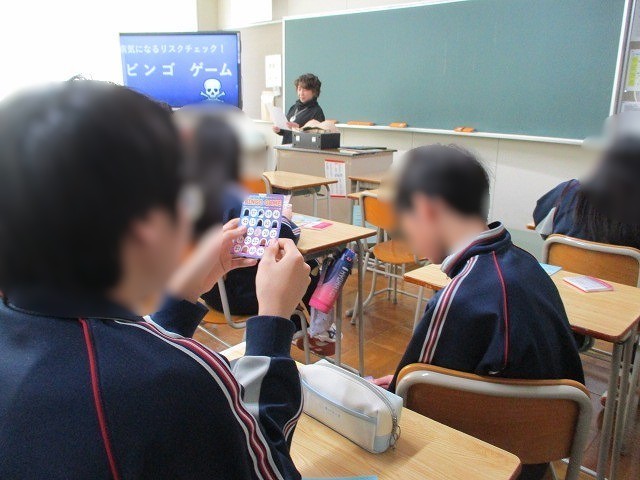 授業では、「自分ががんと言われたら」「家族や友人など身近な人ががんと言われたら」について考えたり、生活習慣によっては、がんになる確率が高くなることビンゴカードを使って学習したりしました。