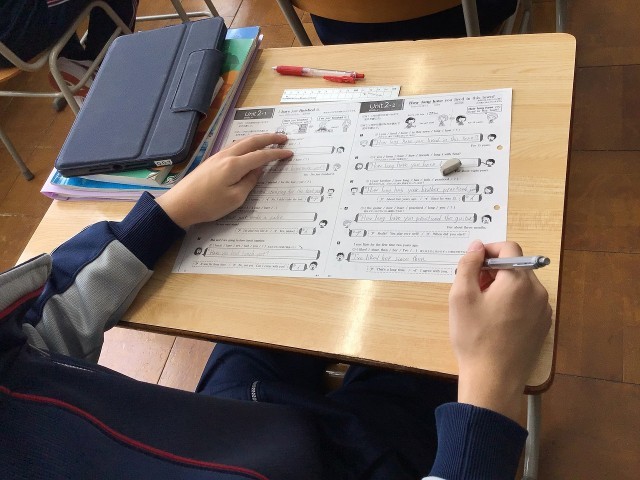 現在完了の構文について学習し、プリントで定着を図っていました。