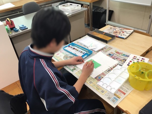 美術は、日本の伝統色について調べ、自分の気になる色を選び、実際に色を作る作業をしていました。