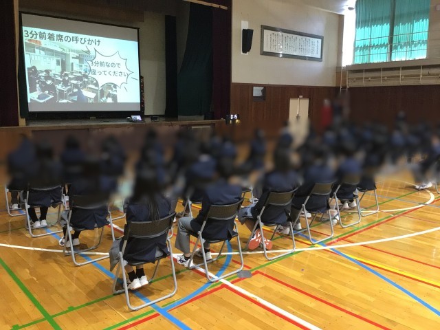 生徒会の生徒が中心となって、中学校生活の説明やレクレーションを行いました。