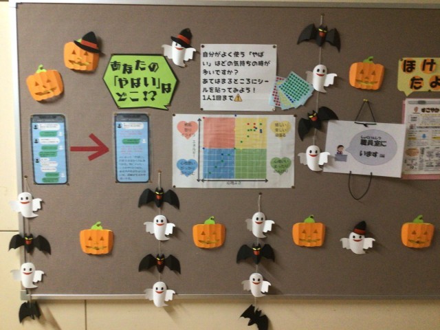 ハロウィンの飾りの中に『あなたの「やばい」はどこ!?』の掲示がされています。